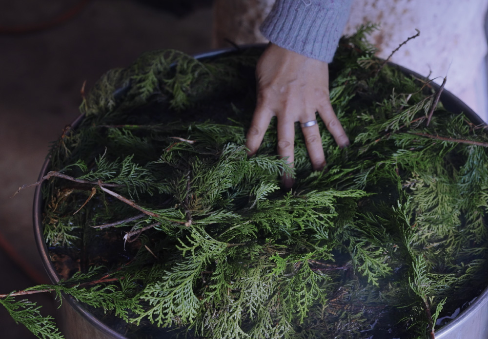 2 − ヒノキの葉を煮出して染料液を作る