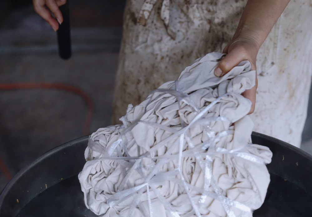 3 − 染料液に尾道帆布を浸し、加熱する