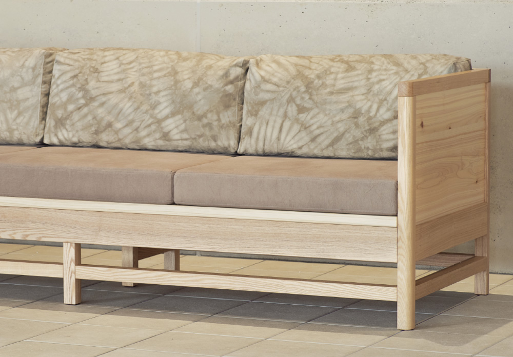 土井木工では、ヒノキの葉や端材を活用した草木染めの染料を立花テキスタイル研究所(広島県尾道市)と共同開発しています。樹のもつ自然で落ち着いた色味が特長です。染色した帆布を使用してクッションなどの生活に寄り添う製品を作り、お客さまのもとへお届けしています。
