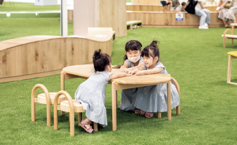 商業施設内に子育てステーションが開設するにあたり、隣接する屋内広場に広島県産材を活用したキッズ家具を製作しました。