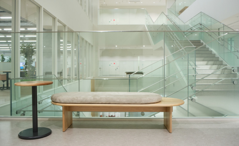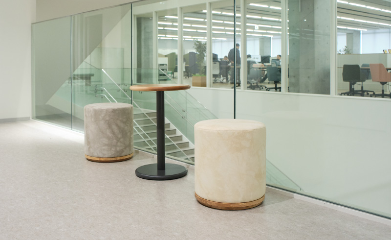 本社新本館の受付と会議室エリアに広島県産広葉樹を活用した内装材と家具を製作いたしました。