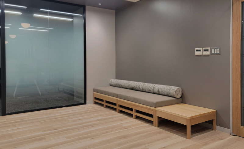 中四国支店のご移転にあたりエントランス・打ち合わせスペースに広島県産ヒノキ材を活用したソファとパーティションを納品いたしました。